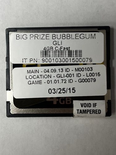 Game Software for Gaming Labs International(GLI), Game Name: BIG PRIZE BUBBLEGUM, Part Numbers: 900103001500079, MAIN – 04.09.13, LOCATION – GLI-001, GAME – 01.01.72, GETT Part Number: SFT-GLI-100
