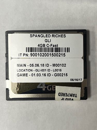 Game Software For Gaming Labs International(GLI), Game Name: Spangled Riches, Part Numbers: IT PN: 900102001500215, MAIN – 05.06.18, LOCATION – GLI-001, GAME – 01.03.16, GETT Part Number: SFT-GLI-101