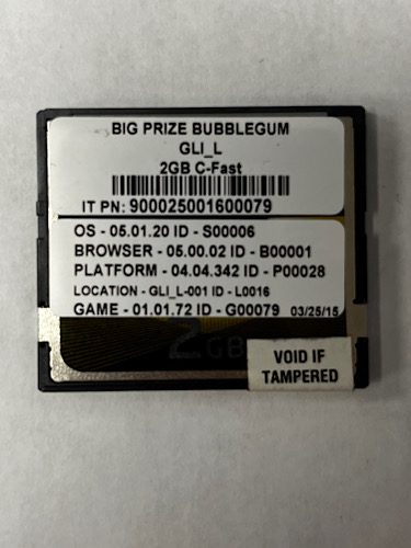 Game Software for Gaming Labs International(GLI), Game Name: BIG PRIZE BUBBLEGUM, Part Numbers: IT PN: 900025001600079, OS – 05.01.20, ID – S00006, BROWSER – 05.00.02, ID – B00001, PLATFORM – 04.04.342, ID – P00028, LOCATION – GLI_L-001, ID – L0016, GAME – 01.01.72, ID – G00079