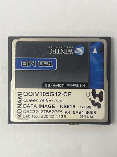 Game Software For Konami Games, Game Name: Queen Of The Inca, Part Numbers: QOIV105G12-CF, DATA IMAGE – KS818, CRC32: 27B52PF5, K4: 8A94-8698, Lab No: S2012-1135