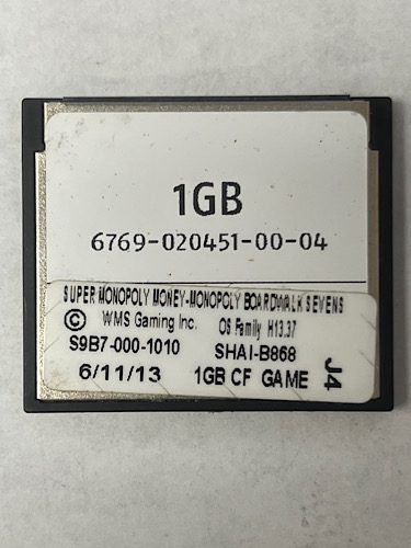 Game Software For WMS BlueBird 2, Game Name: Super Monopoly Money Monopoly Boardwalk Evens, Part Numbers: S9B7-000-1010, SHA1-B868, OS Family H13.37